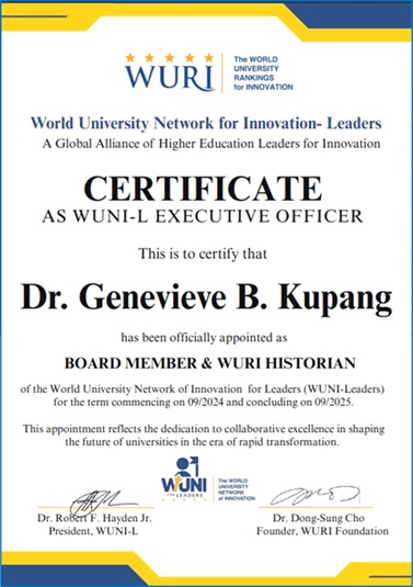 In the same token, Baguio Central University also proudly announces that its International Relations Officer and Dean of the Graduate School, Dr. Genevieve Balance Kupang, has been awarded the Certificate as a member of the board of the WUNI-Leaders and appointed WURI Historian by the World University Network for Innovation (WUNI)-Leaders. This prestigious appointment, endorsed by WURI founder Dr. Dong-sung Cho and WUNI President Dr. Robert F. Hayden, marks Dr. Kupang as the first WURI Historian from the Philippines. She serves on the Board of Directors for the term running from September 2024 through September 2025. This honor reflects her dedication to collaborative excellence and her vital role in shaping the future of higher education amid rapid global transformation.