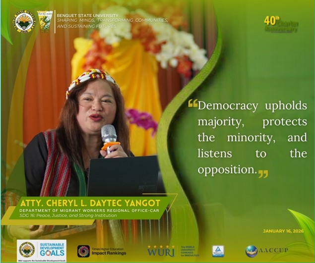 Benguet State University (BSU) formally concluded its ‘Ba’diw ya Binnadang‘ Forum for Sustainable Development on January 16, 2026, with a meaningful dialogue on SDG 16: Integrity in Action. This final session—centered on strengthening anti-corruption, accountability, and inclusive decision-making—marked the culmination of a week-long series of dialogues held in honor of BSU’s 40th Charter Anniversary.