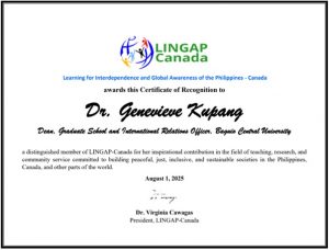 Baguio Central University’s Dr. Kupang Honored by LINGAP-Canada for Global Peacebuilding Leadership