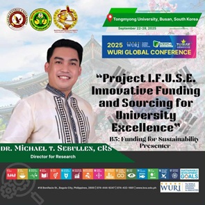 Innovation met inspiration as Baguio Central University (BCU) proudly represented the Philippines at the 2025 World’s Universities with Real Impact (WURI) Global Conference, held at Tongmyong University, Busan, South Korea. The event gathered leaders and innovators in higher education from across the globe to showcase transformative initiatives redefining how universities impact society. As the Director for Research, I had the honor to present Project I.F.U.S.E. (Innovative Funding and Sourcing for University Excellence) under the B5: Funding for Sustainability category — an initiative that embodies BCU’s enduring commitment to creativity, sustainability, and purposeful leadership in education.